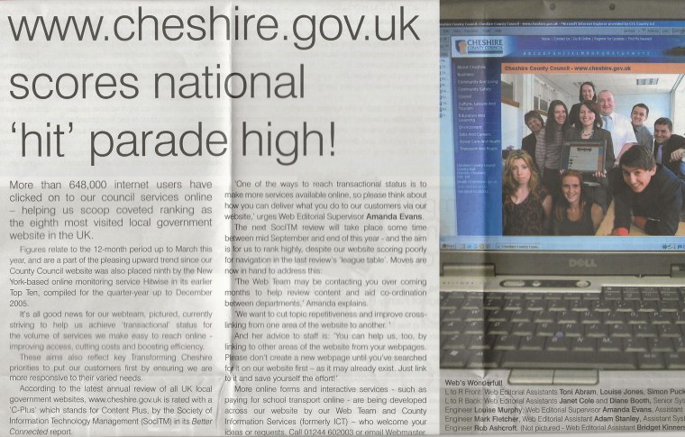 I built my first website in 2001 and from 2005 – 2018 worked in local government as a web editorial assistant. In 2006 the Cheshire County Council web team appeared in the internal newsletter. It was reported we had scored a national ‘hit’ parade high, with more than 648,000 internet users having clicked on to the Council services online, helping to scoop the coveted ranking as the eighth most visited local government website in the UK. It all seems incredibly wide eyed and innocent now but at the time the world was pretty much changing in real time in front of our eyes, as we encouraged our customers to ‘do it online.’ Websites were cluttered, dis-organised, used outlandish fonts and colours, had background music, guest books and counters to show the number of people who had visited the website and it wasn’t unusual to have text scrolling or flying across the screen.